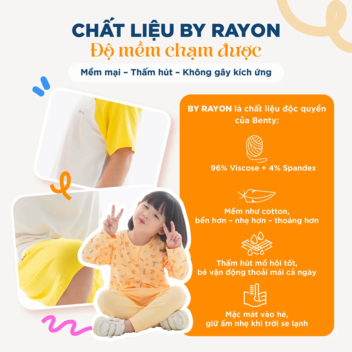 By Rayon được sản xuất tâm huyết bởi Benty, chất liệu gồm 96% viscose + 4% spandex. Tương tự như cotton nhưng By Rayon ưu việt hơn bởi tính bền của sản phẩm. Độ thấm hút cao luôn giúp bé thoải mái vận động, phù hợp cho mọi mùa trong năm. Bên cạnh đó, chất liệu này còn giữ cho bé ấm áp trong những ngày se lạnh.