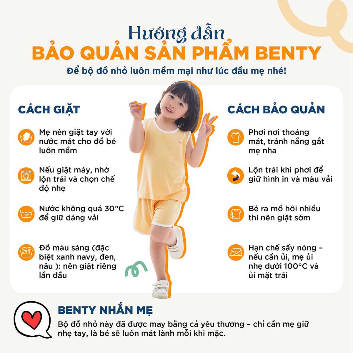 - Không sử dụng chất tẩy trắng để làm sạch quần áo cho bé trai, bé gái - Khi giặt bằng máy nên phân loại quần áo cho bé và sử dụng túi giặt - Không sử dụng nhiệt độ cao để sấy khô bộ quần áo - Khi quần áo bị dính bẩn hãy làm sạch bằng nước lạnh và chất giặt nhẹ - Nên giặt tay để giữ độ mềm mại của quần áo trẻ em2. Cam kết bộ quần áo BENTY cho bé