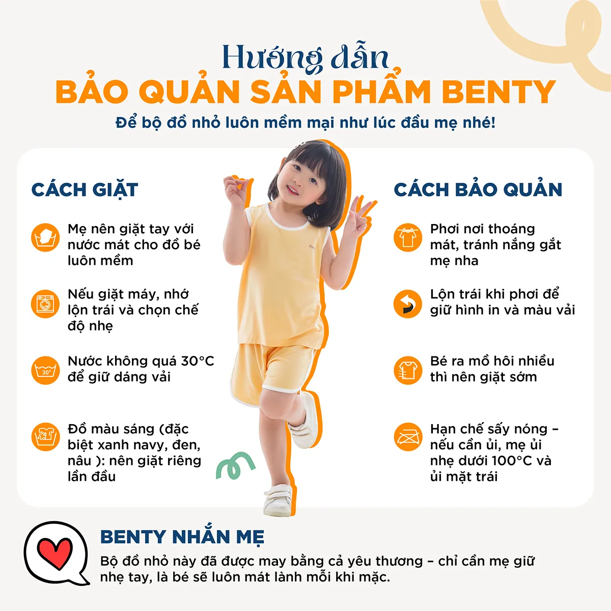 - Không sử dụng chất tẩy trắng để làm sạch quần áo cho bé trai, bé gái - Khi giặt bằng máy nên phân loại quần áo cho bé và sử dụng túi giặt - Không sử dụng nhiệt độ cao để sấy khô bộ quần áo - Khi quần áo bị dính bẩn hãy làm sạch bằng nước lạnh và chất giặt nhẹ - Nên giặt tay để giữ độ mềm mại của quần áo trẻ em2. Cam kết bộ quần áo BENTY cho bé