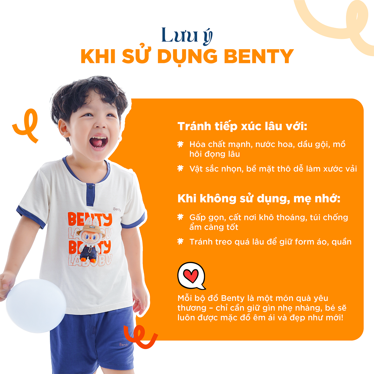 - Không sử dụng chất tẩy trắng để làm sạch quần áo cho bé trai, bé gái - Khi giặt bằng máy nên phân loại quần áo cho bé và sử dụng túi giặt - Không sử dụng nhiệt độ cao để sấy khô bộ quần áo - Khi quần áo bị dính bẩn hãy làm sạch bằng nước lạnh và chất giặt nhẹ - Nên giặt tay để giữ độ mềm mại của quần áo trẻ em2. Cam kết bộ quần áo BENTY cho bé